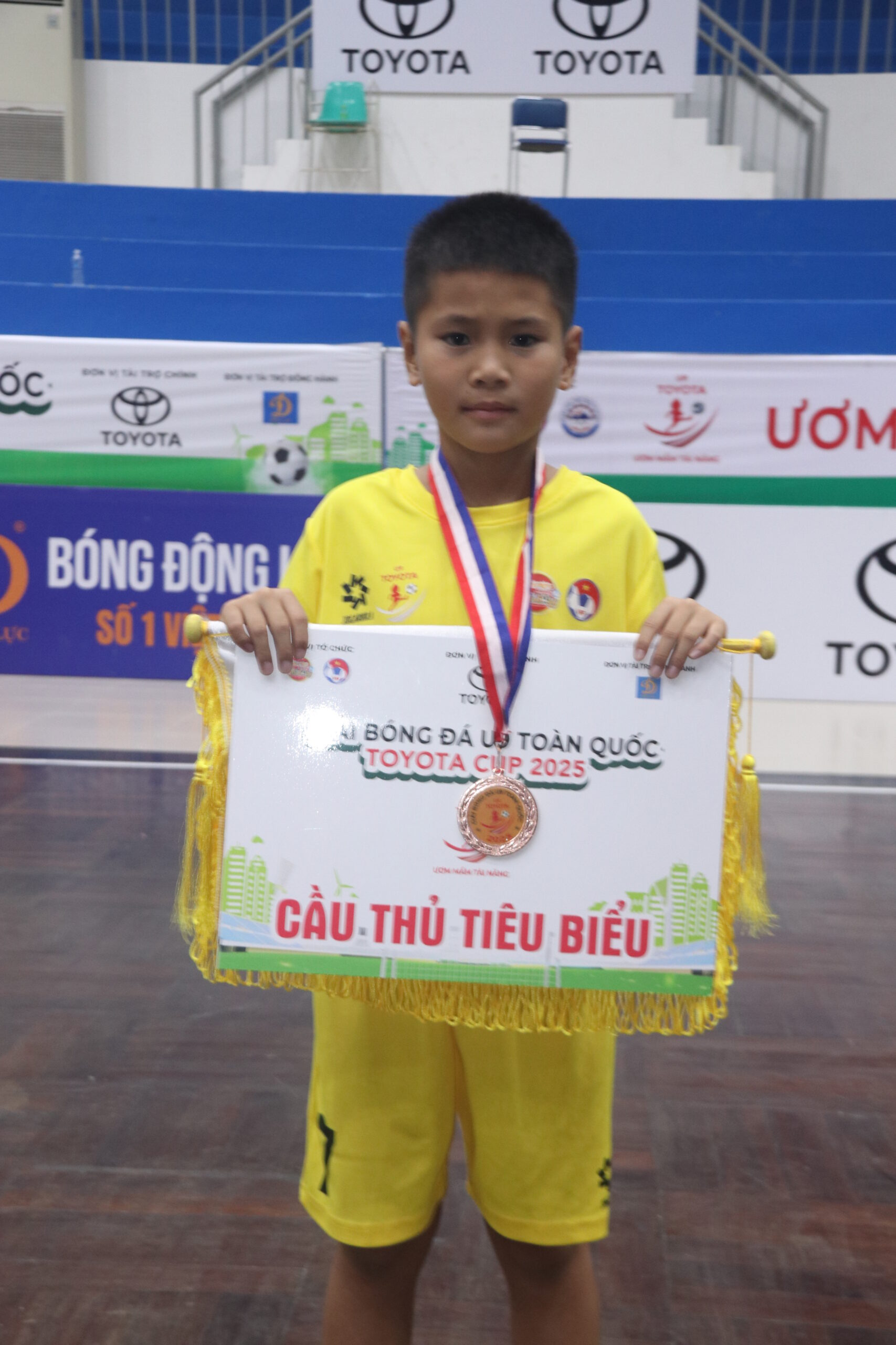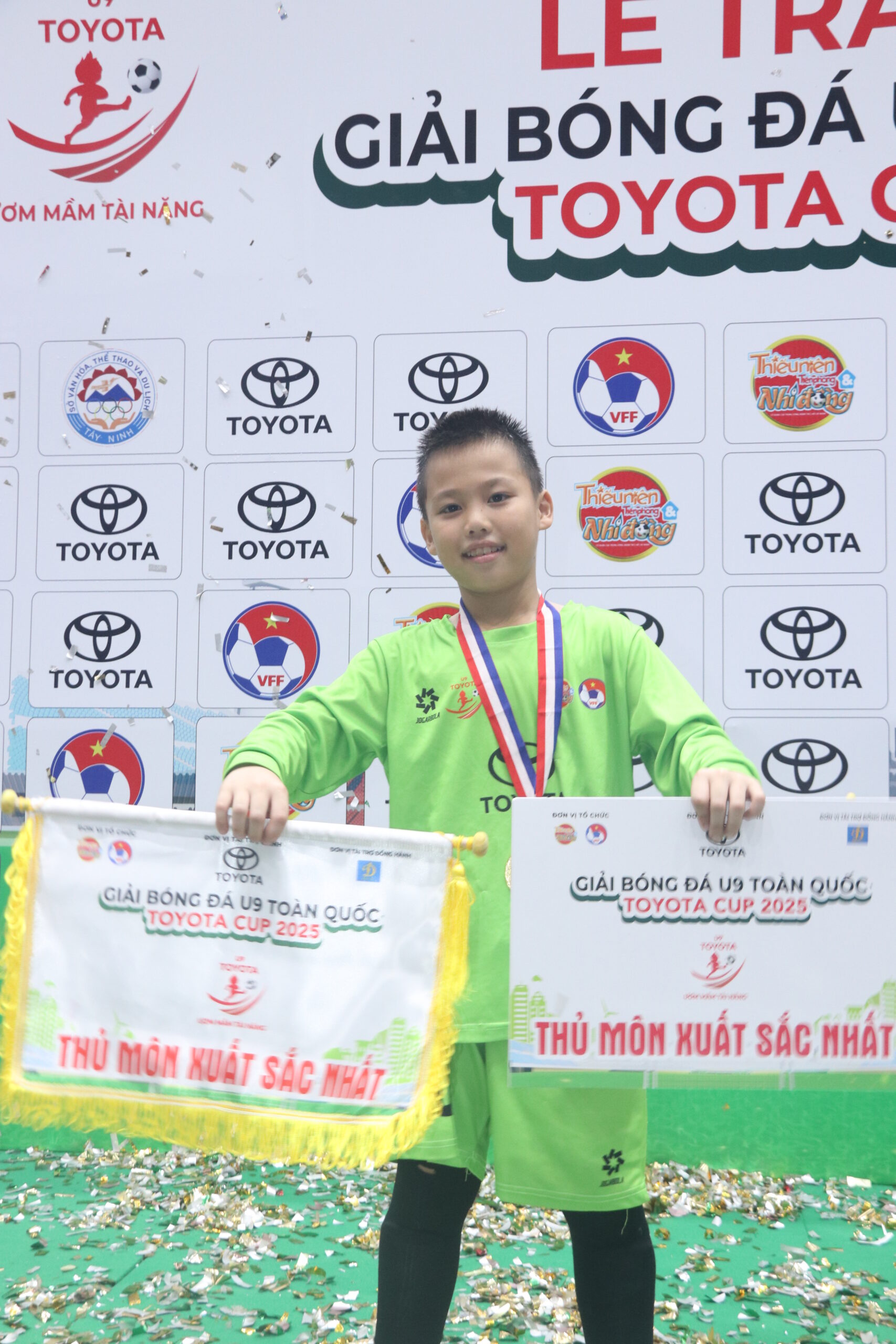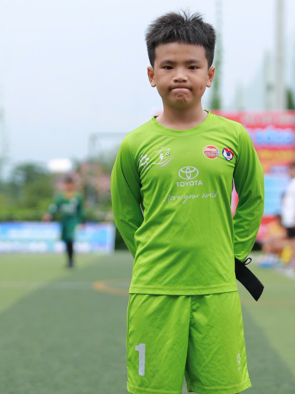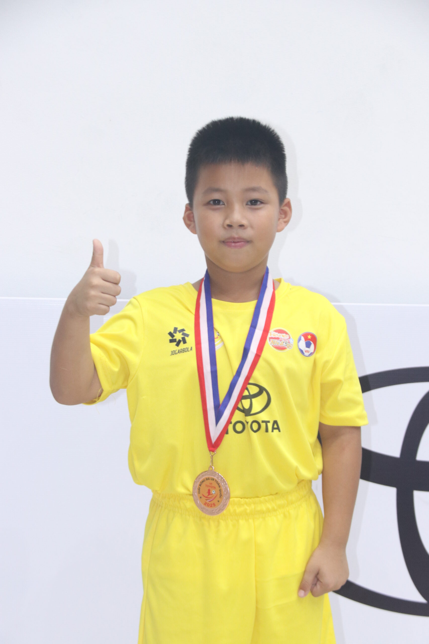 Lê Văn Dũng là thủ môn xuất sắc của Giải Bóng đá U9 toàn quốc Toyota Cup 2025. Trấn giữ khung thành, Dũng thể hiện khả năng phản xạ nhanh nhẹn, sự tập trung cao độ và luôn quyết đoán trong từng pha bóng. Không chỉ yêu thích bóng đá, bạn ấy còn có năng khiếu chơi bóng chuyền, giúp rèn luyện sức bật và sự dẻo dai. Thần tượng của cầu thủ nhí chính là thủ môn nổi tiếng De Gea – người truyền cảm hứng với những pha cứu thua ngoạn mục.