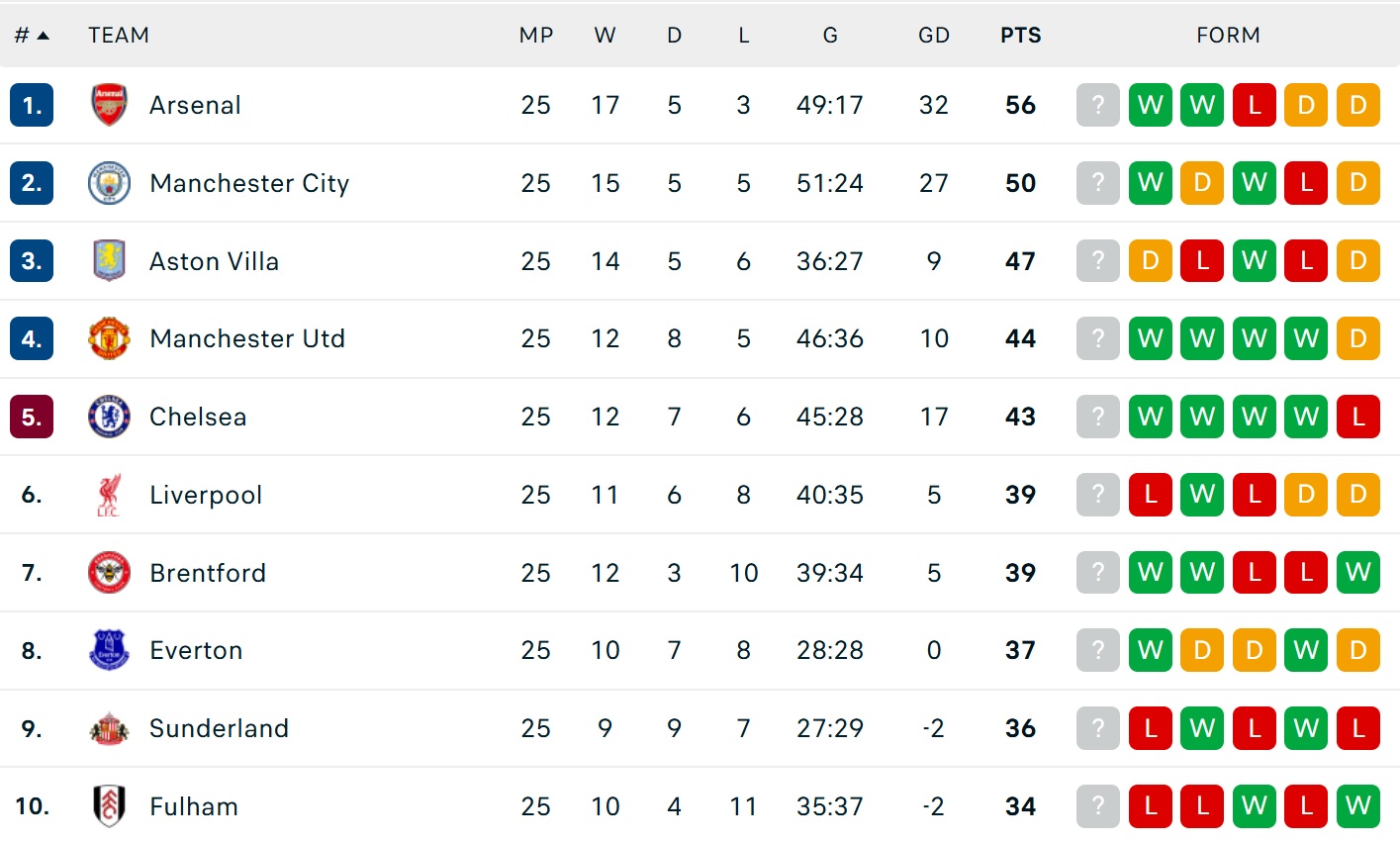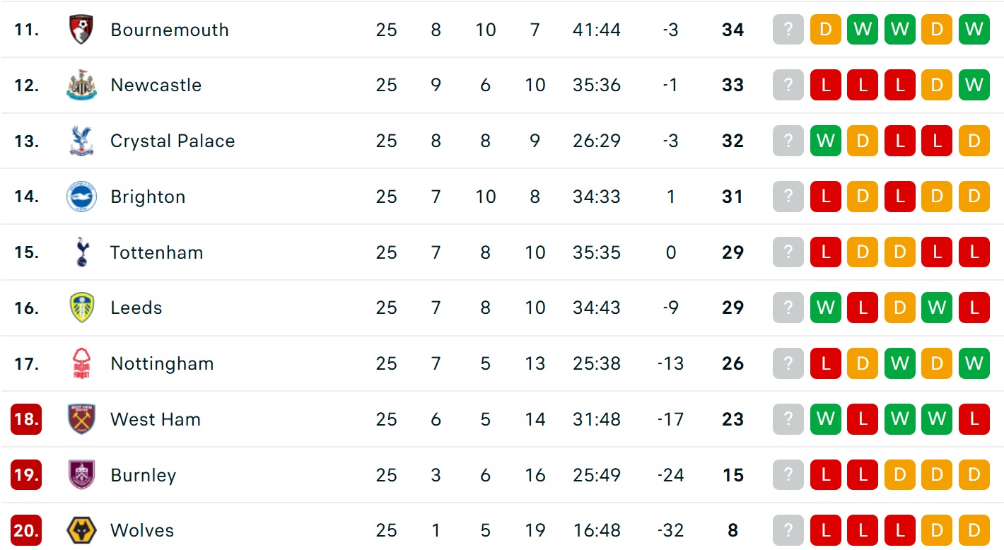 Ngược lại, Liverpool vẫn đứng thứ 6 nhưng đã kém Chelsea và MU lần lượt 4 và 5 điểm, khiến mục tiêu giành vé dự Champions League thêm khó khăn.