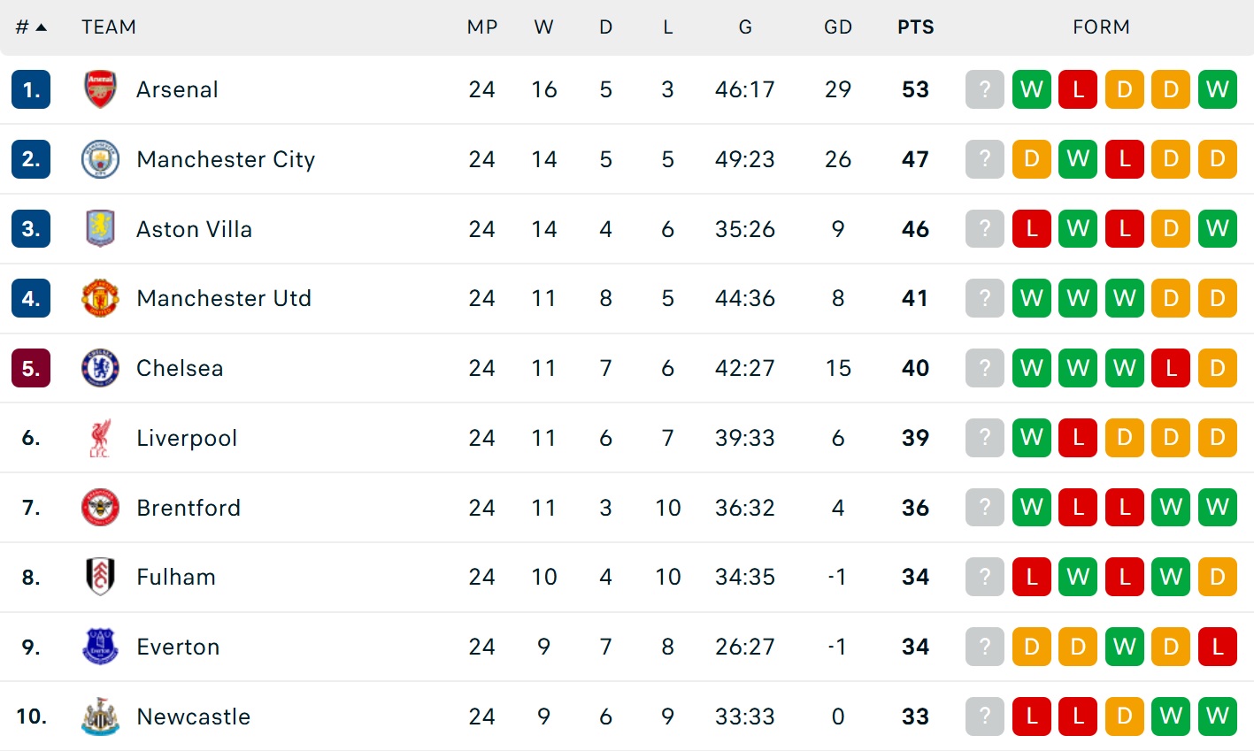 Bảng xếp hạng Ngoại hạng Anh mới nhất