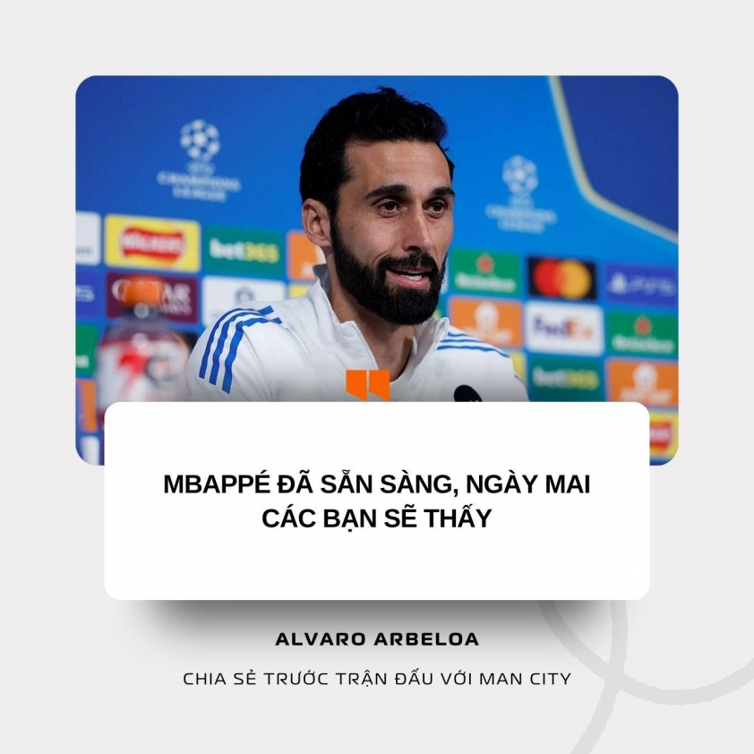 Đánh giá về mức độ khó khăn của trận đấu với Manchester City, Arbeloa nhấn mạnh: “Chúng tôi hiểu rất rõ mức độ khó khăn của trận đấu ngày mai và đối thủ mà mình phải đối mặt. Nếu muốn chiến thắng, chúng tôi phải thi đấu ở đẳng cấp rất cao, giống như trận lượt đi hoặc thậm chí còn tốt hơn, với tinh thần đoàn kết, nỗ lực và hy sinh, đồng thời tìm cách gây tổn thương cho họ.”