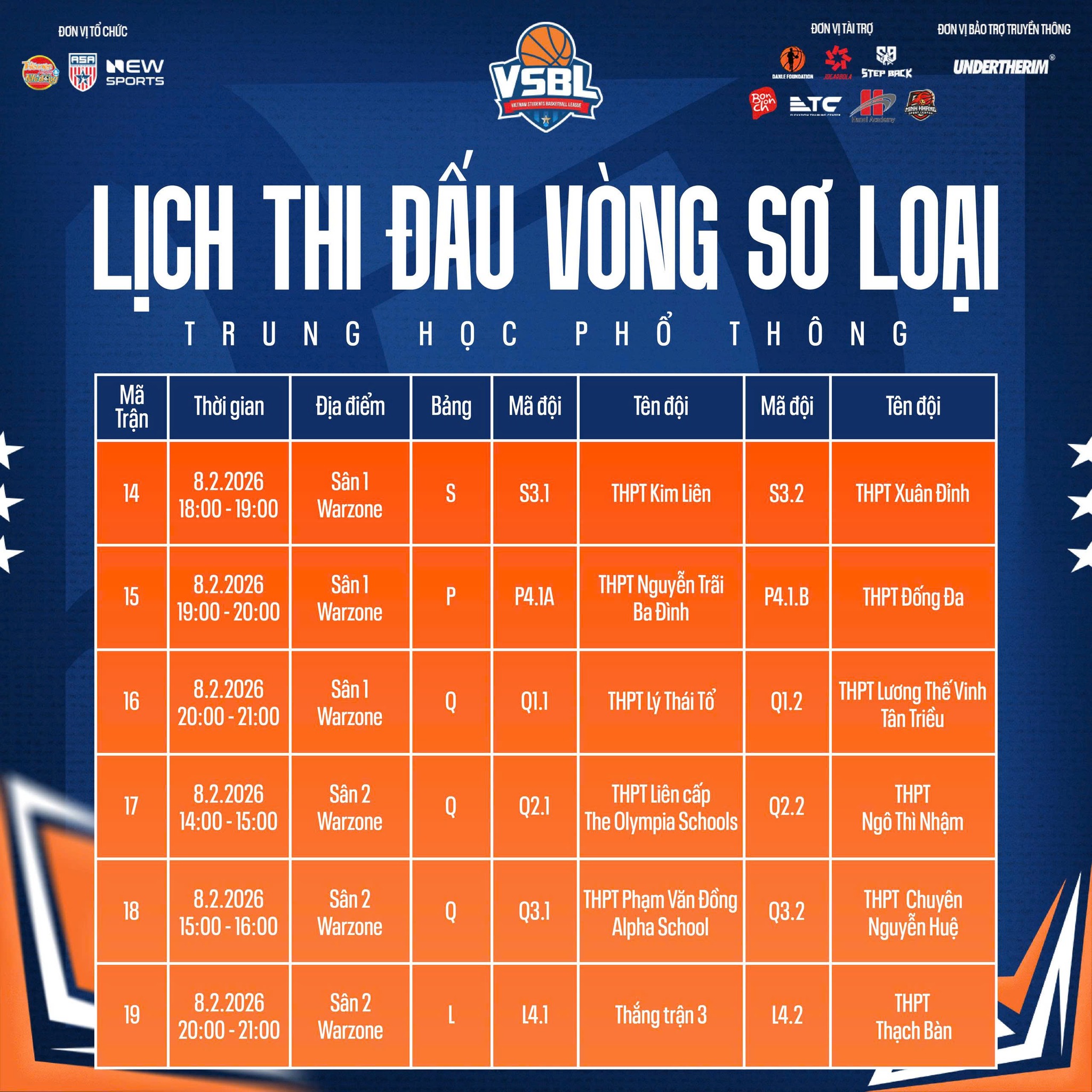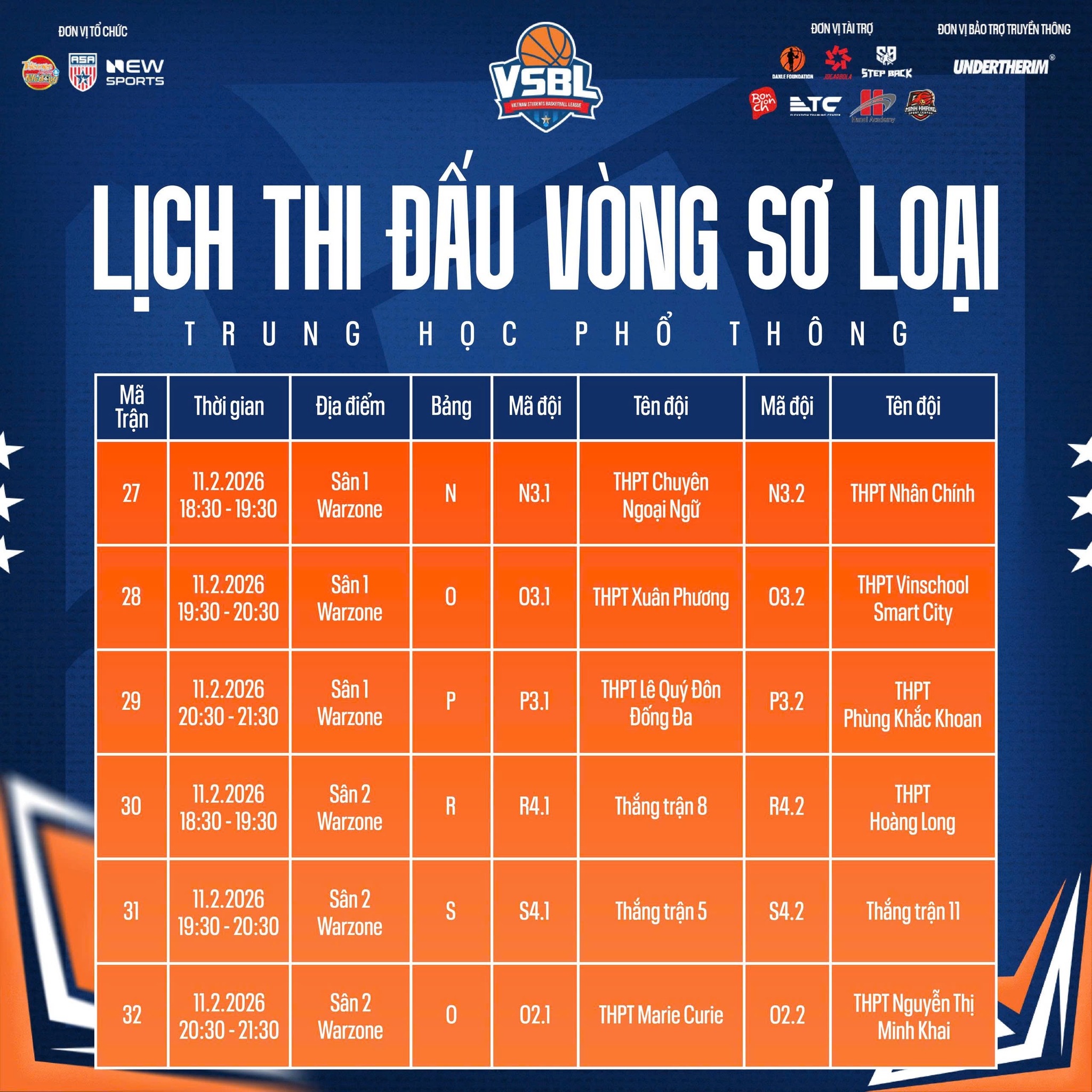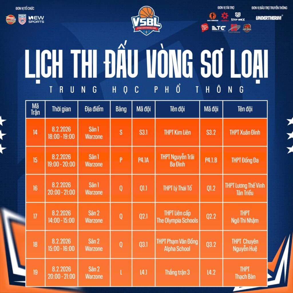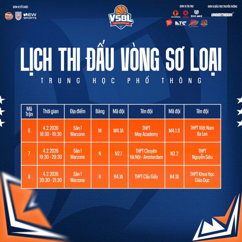 Ban Tổ chức Vietnam Students Basketball League (VSBL) mùa giải thứ 5 đã chính thức công bố lịch thi đấu vòng Sơ loại, đánh dấu thời điểm khởi tranh của một mùa giải bóng rổ học sinh được mong chờ. Đây là giai đoạn mở màn quan trọng, nơi các đội bóng đến từ các trường bước vào những trận đấu đầu tiên, hướng tới mục tiêu cạnh tranh suất đi tiếp tại VSBL 5.