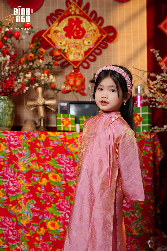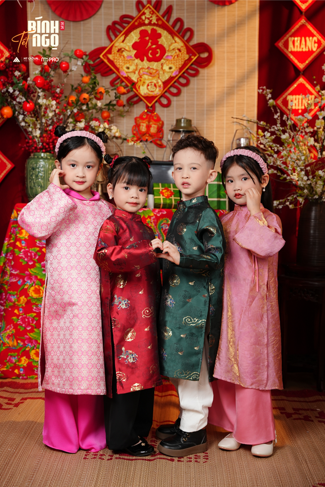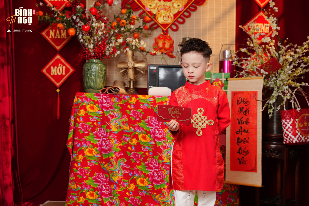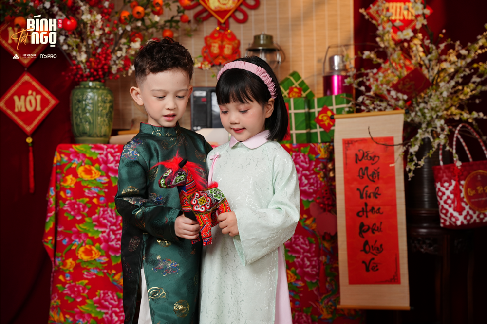 Tại MT Group, một góc Tết Việt được dựng lên với sắc đỏ may mắn, bánh chưng xanh, câu đối vàng và những cành hoa rực rỡ. Các bạn mẫu nhí hào hứng khoác lên mình tà áo dài, khi e ấp, khi tinh nghịch, giống như đang đứng trong phòng khách ngày mùng Một Tết của chính gia đình mình.