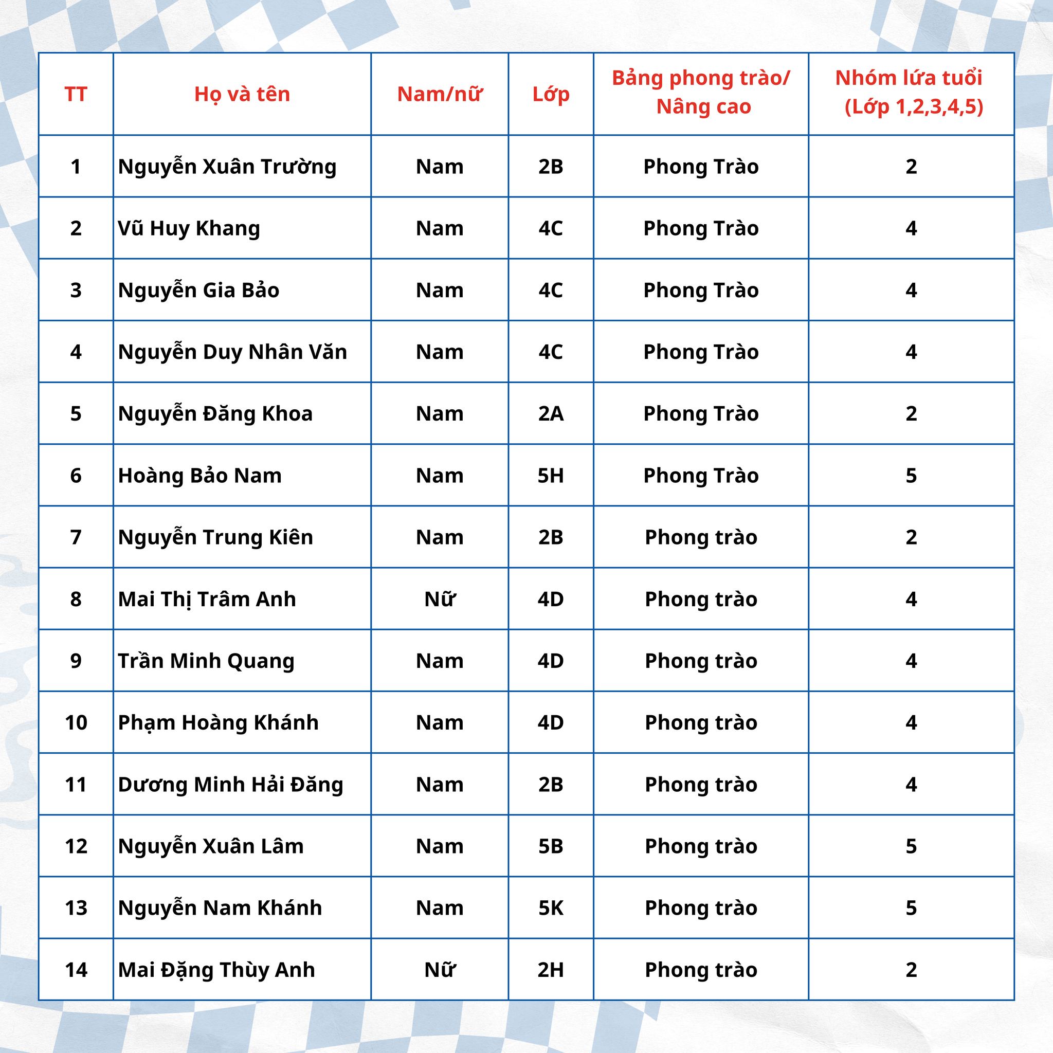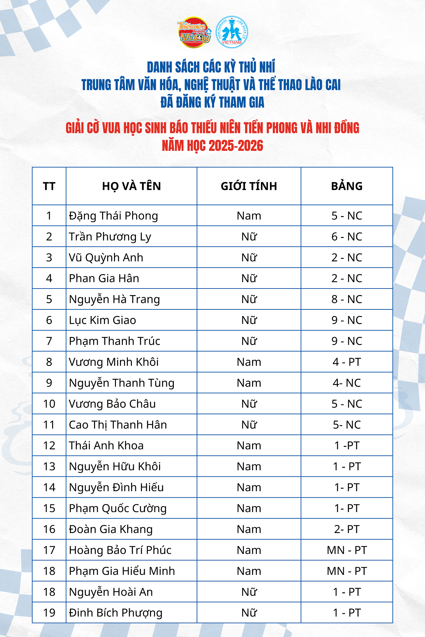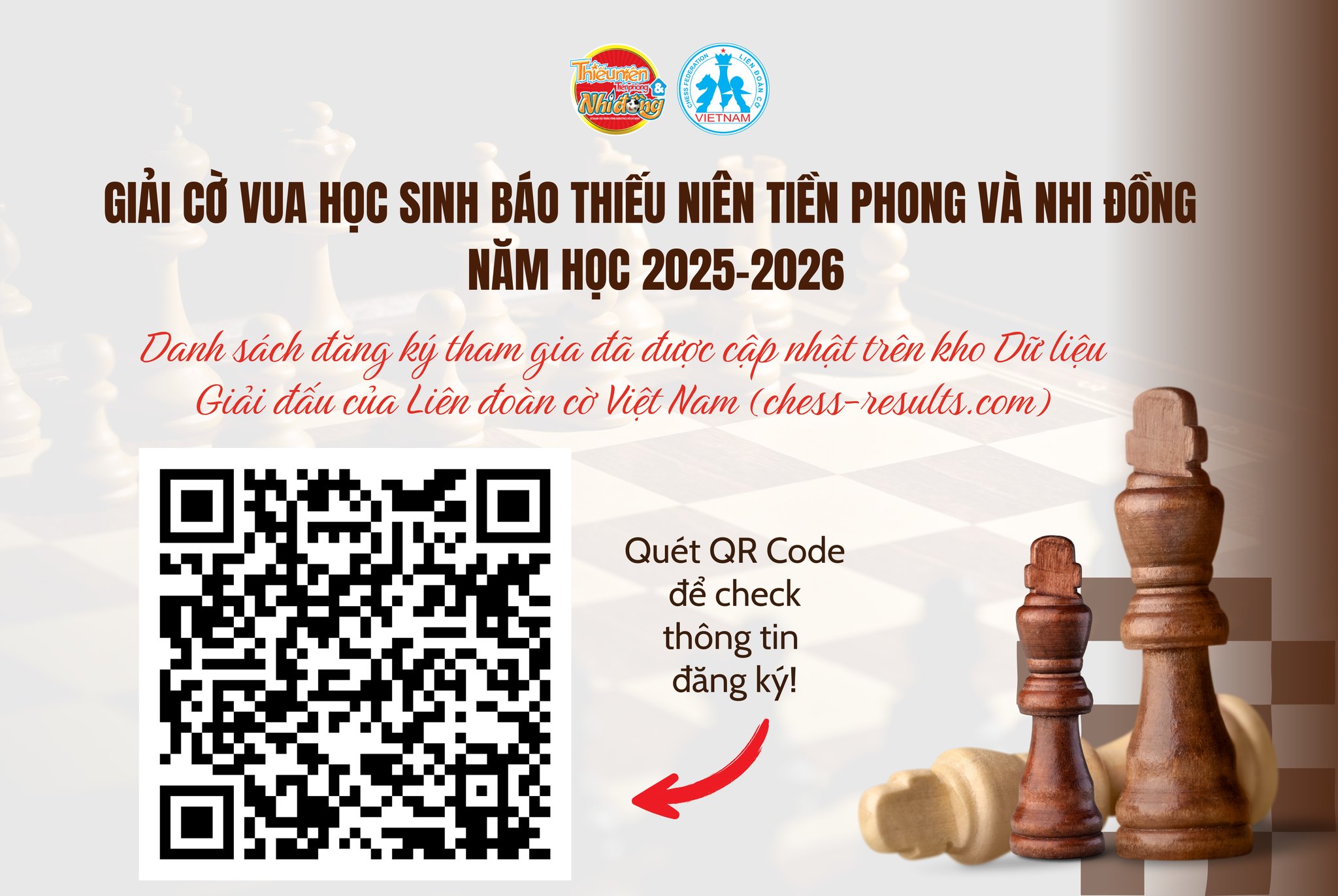 Danh sách tổng hợp các kỳ thủ tham dự giải đã được cập nhật dần mỗi ngày trên hệ thống kho dữ liệu giải đấu của Liên đoàn Cờ Việt Nam (chess-results.com), đảm bảo thông tin minh bạch, khoa học và thuận tiện cho công tác tổ chức. Quý phụ huynh và thầy cô có thể kiểm tra thông tin đăng ký của các kỳ thủ nhí trên hệ thống. Trường hợp phát hiện sai sót hoặc thiếu thông tin, xin liên hệ hotline của Ban Tổ chức để được hỗ trợ cập nhật kịp thời.