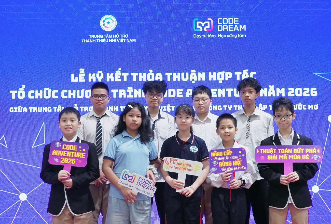 Ngày 02/04/2026 tại Hà Nội, Trung tâm Hỗ trợ Thanh thiếu nhi Việt Nam (VYCSC) và Công ty TNHH Lập trình Ước mơ – Trung tâm tin học CodeDream chính thức ký kết Thỏa thuận hợp tác tổ chức chương trình “Code Adventure – Thuật toán bứt phá, giải mã mùa hè” năm 2026, nhằm thúc đẩy phát triển năng lực số, tư duy công nghệ cho thanh thiếu nhi.