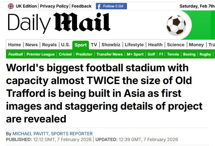 Daily Mail cũng đưa tin đây sẽ là sân vận động lớn nhất thế giới sau khi hoàn thành